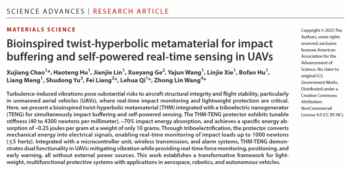 近日,机电学院齐乐华教授团队在兼顾冲击防护与自供能传感的力学超结构方面的研究取得新进展。相关成果《Bioinspired Twist-Hyperbolic Metamaterial for Impact Buffering and Self-Powered Real-Time Sensing in UAVs》发表在Science 子刊《Science Advances》上。机电学院晁许江副教授为第一作者,柔电院梁飞副教授、齐乐华教授和中科院王中林教授为通讯作者。原文链接:https://ww...